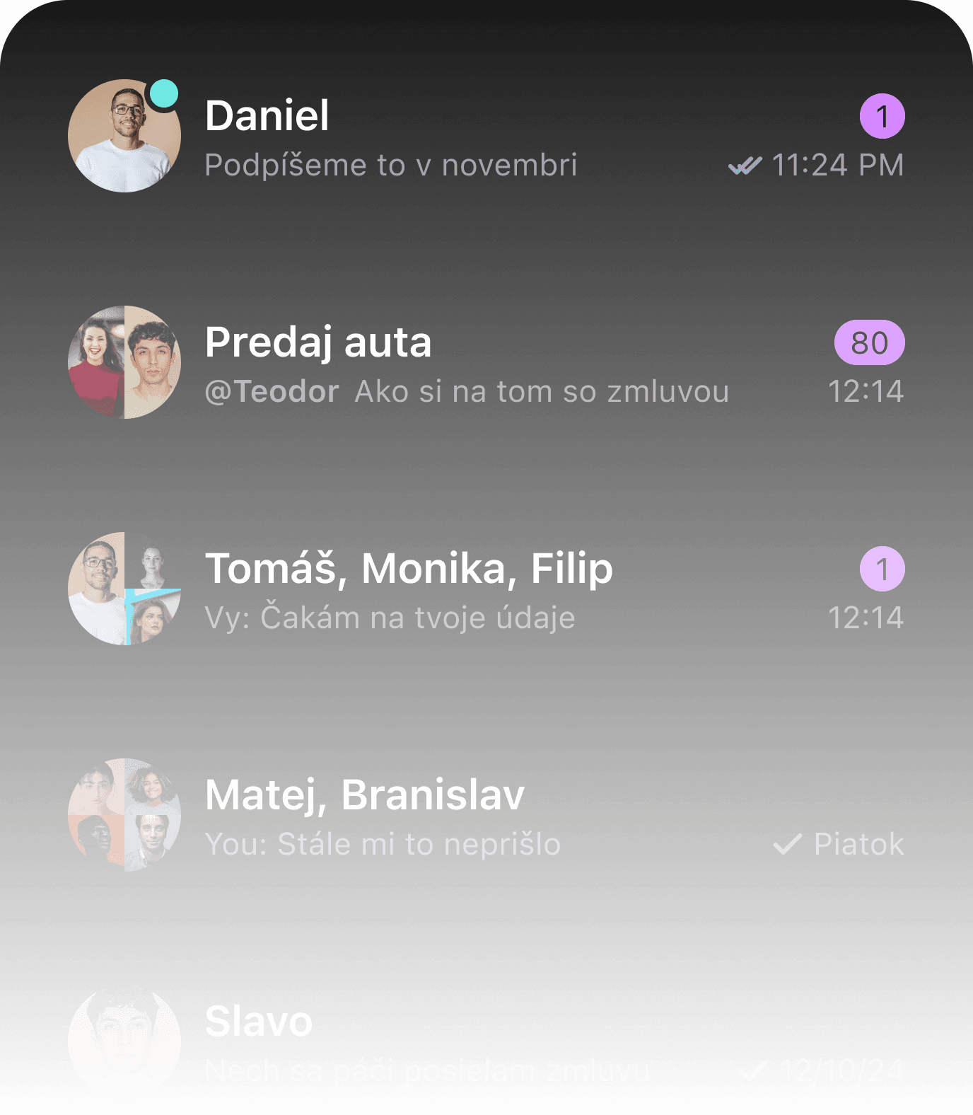 Chatujte so zmluvnými partnermi, vytvárajte skupiny a posielajte vytvorené zmluvy.