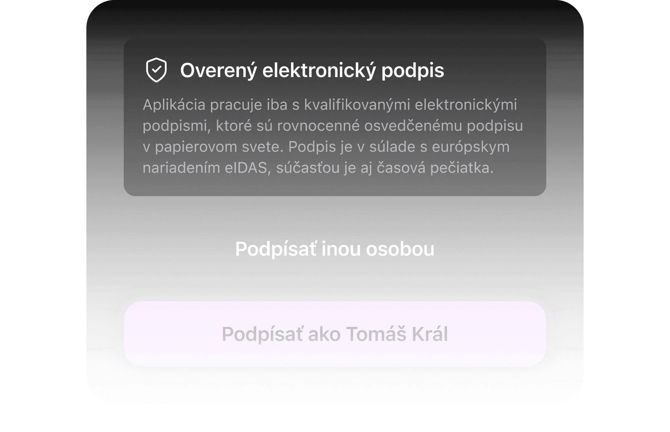 Prinášame elektronický podpis, ktorý je rovnocenný osvedčenému podpisu v papierovom svete. Podpis je v súlade s európskym nariadením eIDAS, súčasťou je aj časová pečiatka.